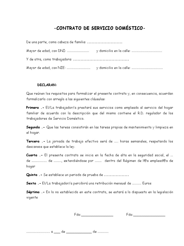 Conforme a la Ley es obligatorio formalizar un contratoEn caso contrario estaramos incurriendo en una infraccin que puede. Modelo contrato empleada hogar por escrito salvo servicios espordicos. MODELO CONTRATO EMPLEADA DE HOGAR POR HORAS.