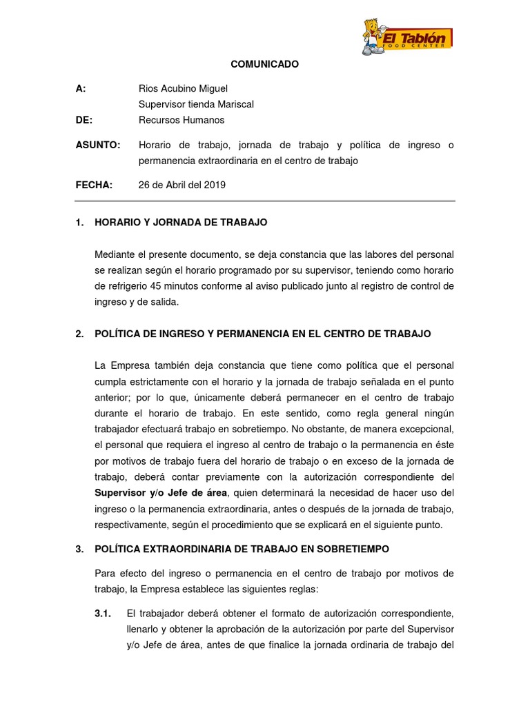 Solicita autorizacin para realizar las siguientes horas suplementarias. 3- Comunicado donde se da a conocer a los trabajadores la obligacin de laborar horas extras motivadas por haberse presentado necesidades en razn de un hecho fortuito especifico.