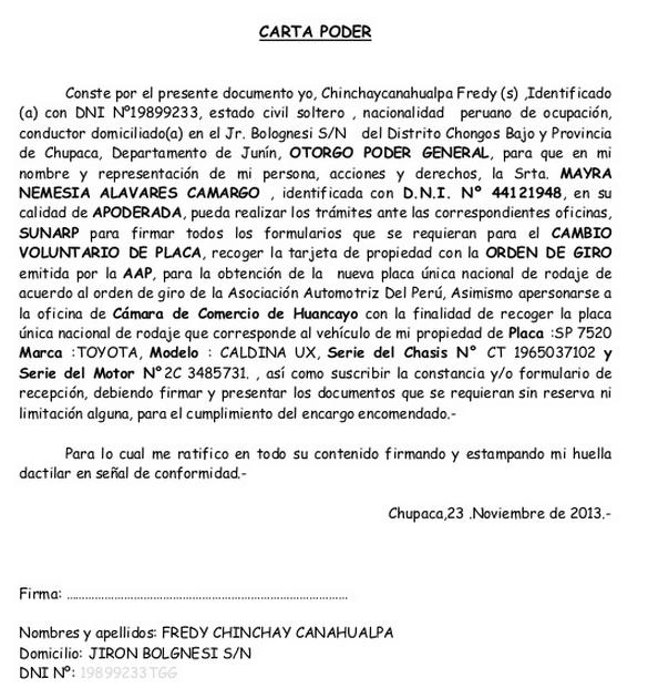 Como consejo adicional cuando la carta poder involucra a una institucin empresa entidad estatal entre otros se recomienda llamar y consultar acerca de los documentos y especificaciones que piden para que ese tramite lo pueda realizar otra persona por lo general les darn toda la informacin y as podrn elaborar la carta de poder sin omitir. Conozca las caractersticas requisitos modelos formatos Online y minutas del Poder General de Representacin. Otorgar poder a uno de los Padres sobre un hijo menor de edad modelo Publicado el 10 de junio de 2017.